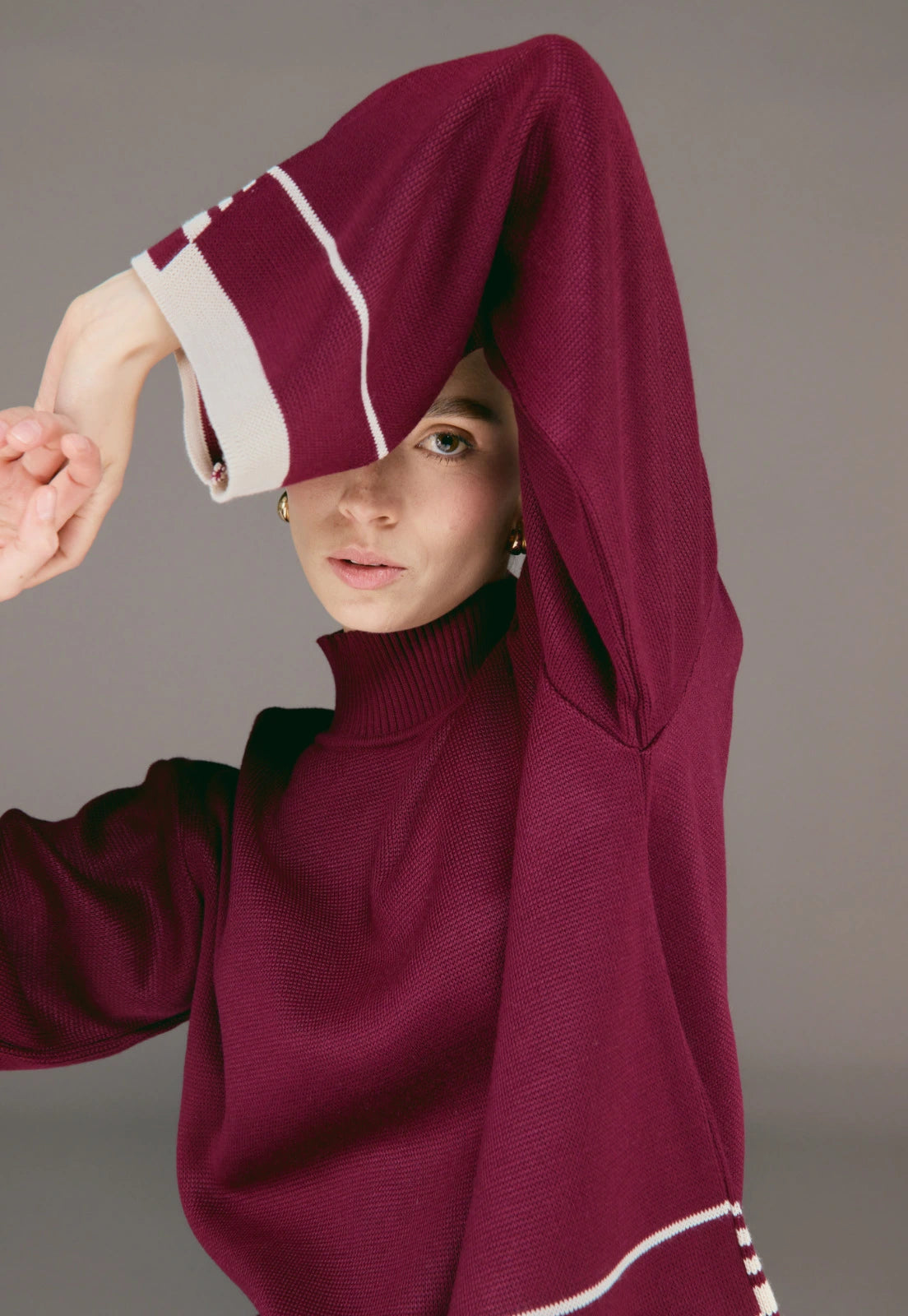Buzo Amanda de cuello alto para mujer, con corte holgado y tejido Jacquard, detalle lineal en puños y parte inferior.