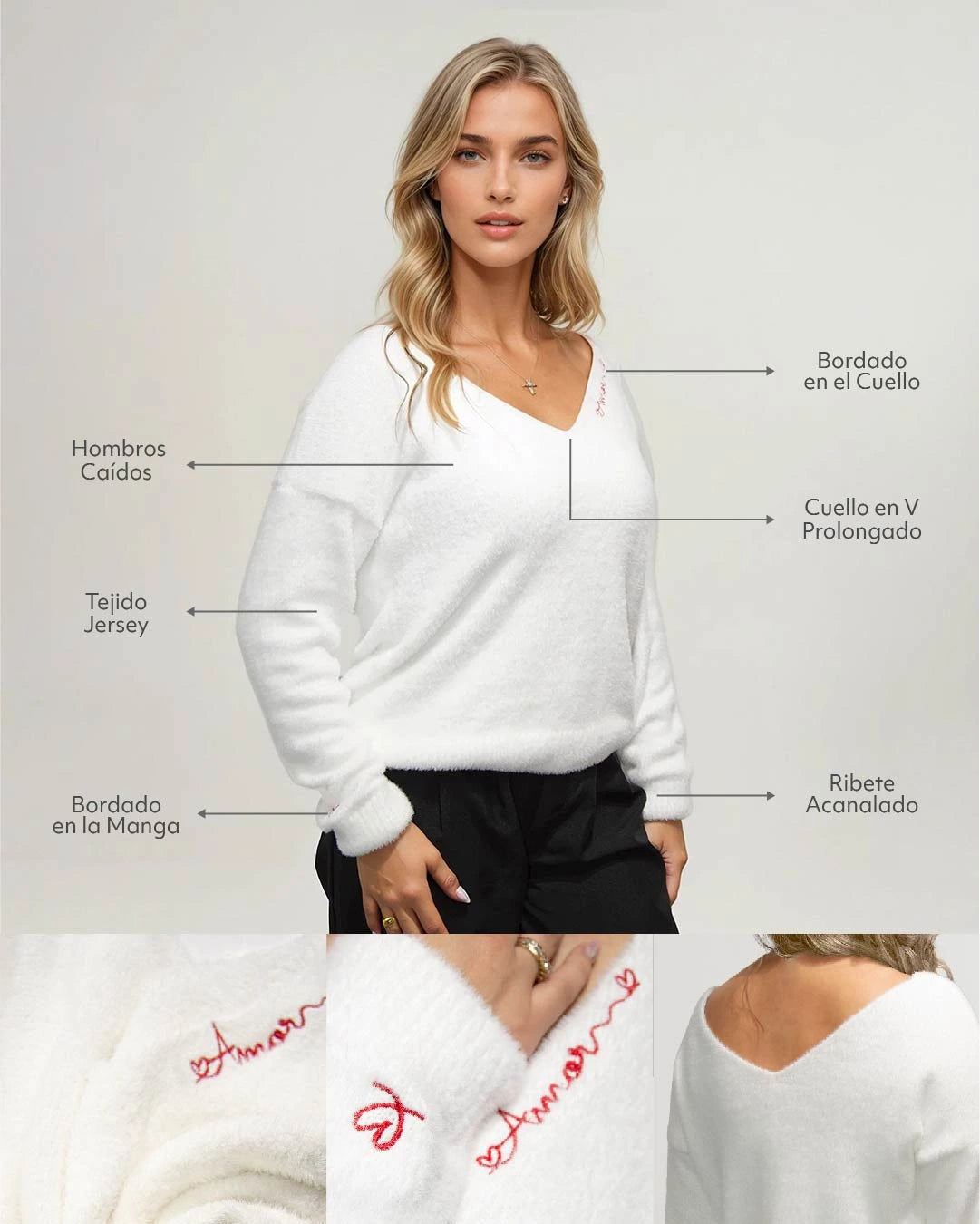 • Detalles que Marcan la Diferencia: Cuello en V prolongado, hombros caídos, ribete acanalado en puños y cuello, y detalles bordados exclusivos.