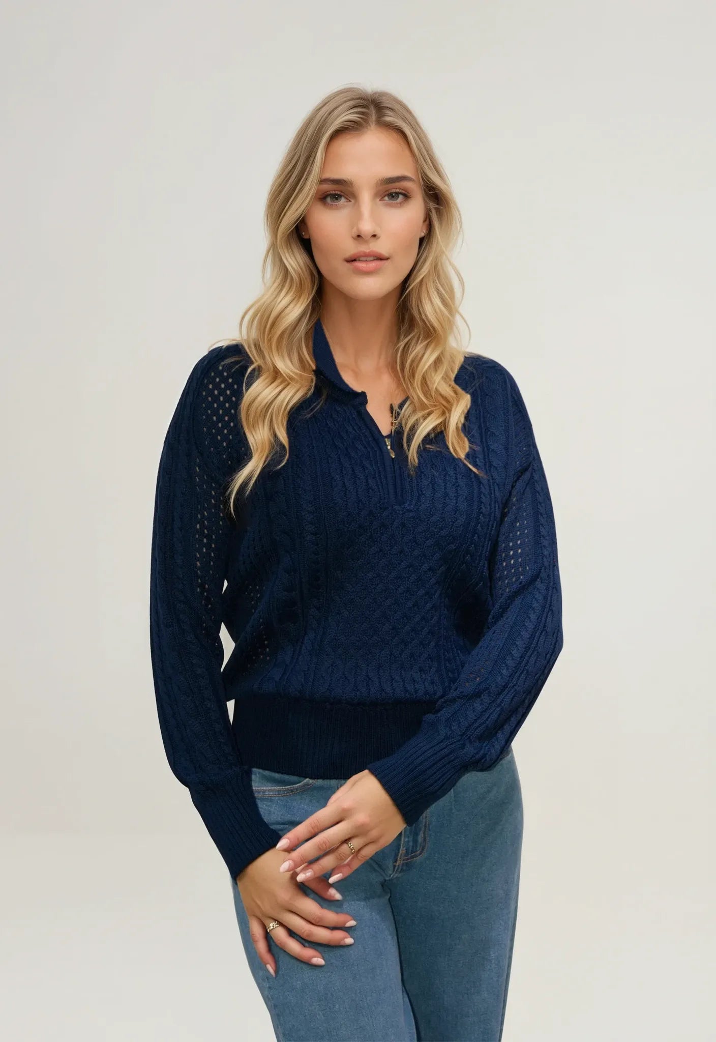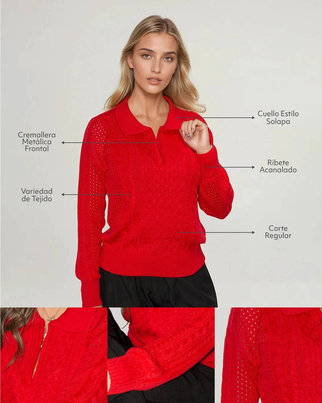 Prenda femenina tejida, cuello estructurado, cremallera metálica de medio largo, suavidad al tacto, combinación de tejidos trenzados y calados.