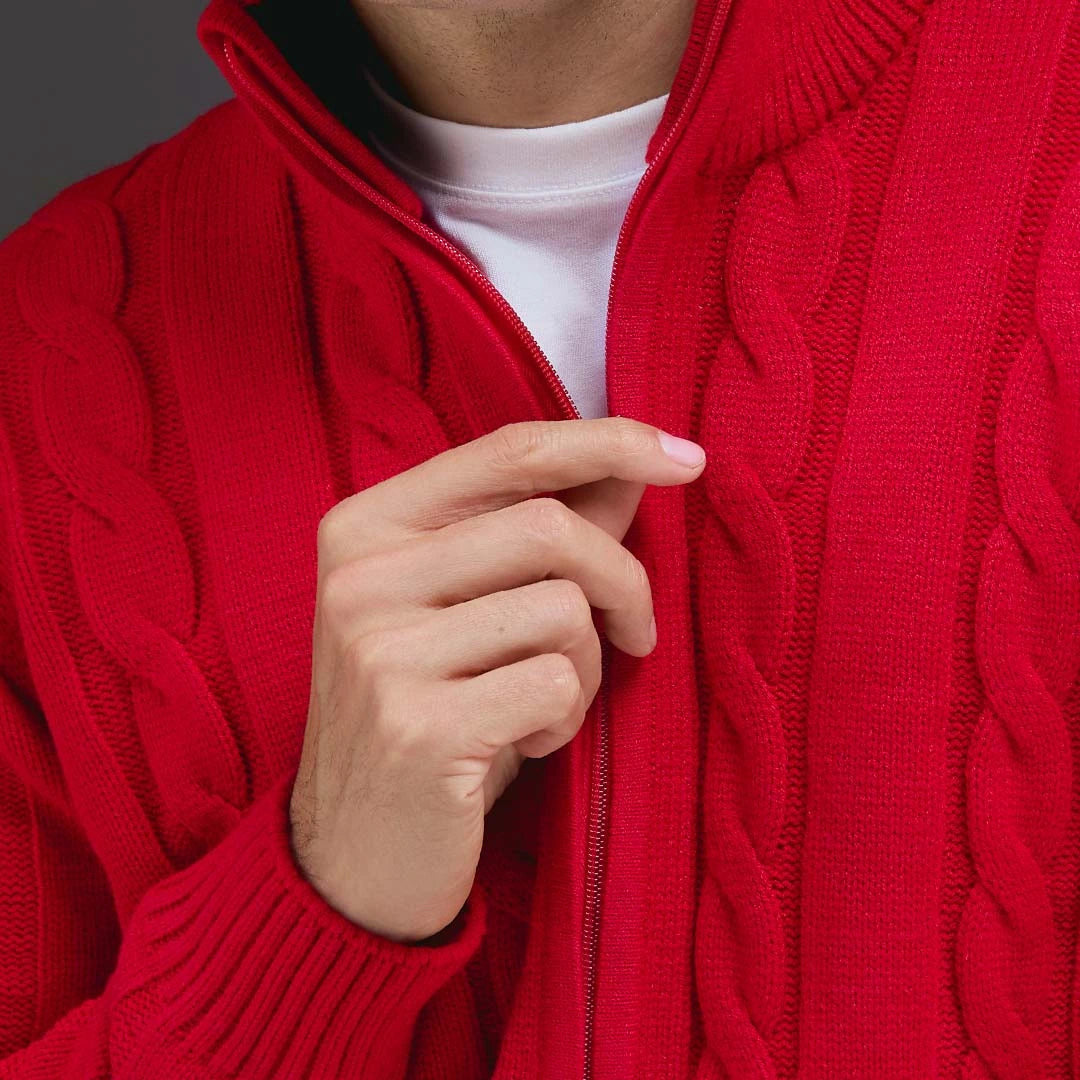 La chaqueta se distingue por su tejido grueso y trenzado, que no solo le proporciona un aspecto distintivo, sino que también garantiza durabilidad y calidez. Esta característica la convierte en una opción ideal para los meses más fríos del año.