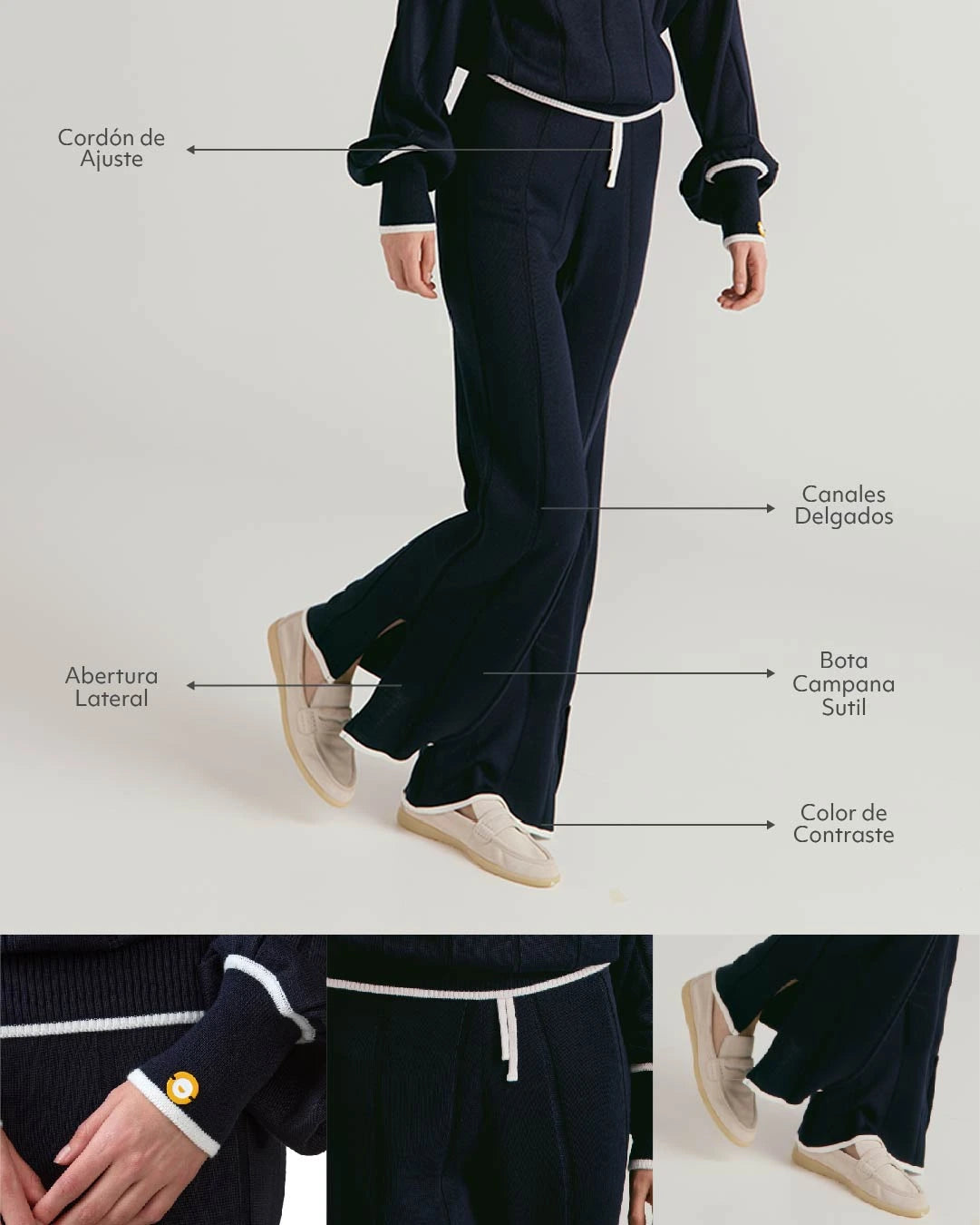 Este pantalón tejido acanalado se destaca por su corte regular con tiro medio, elástico oculto en la cintura y cordón de ajuste. Su bota ancha y los detalles lineales en la cintura y la parte inferior le otorgan un toque moderno y sofisticado.