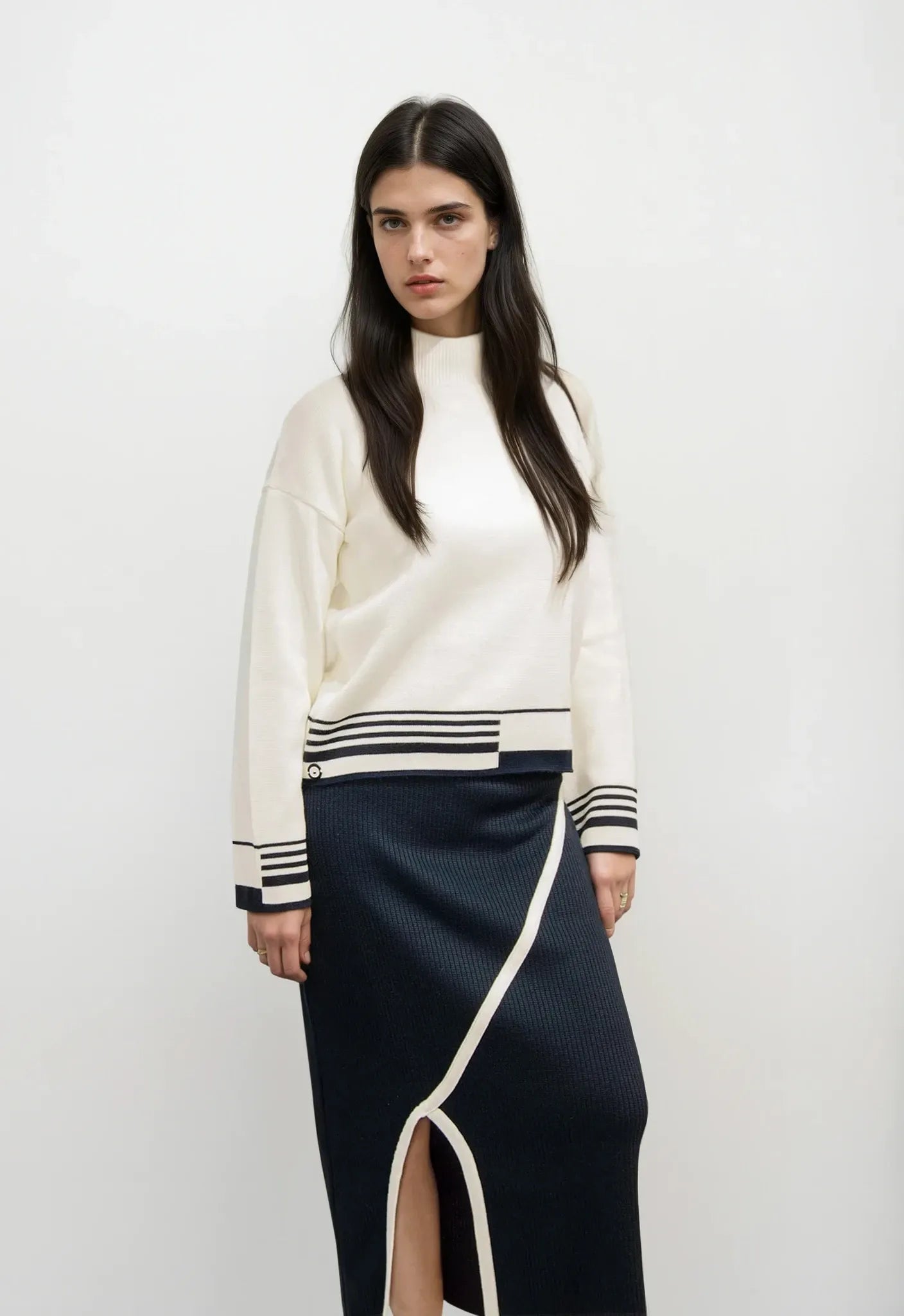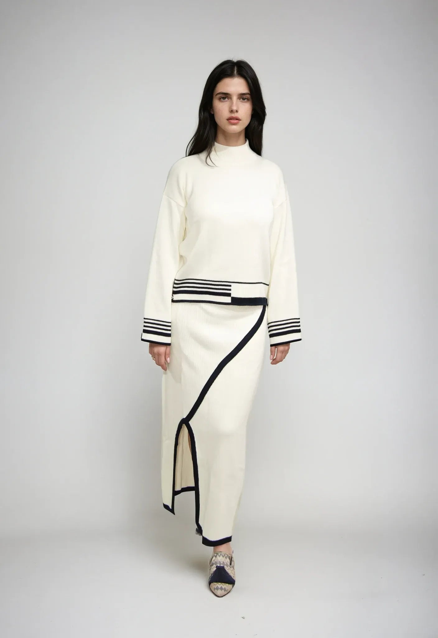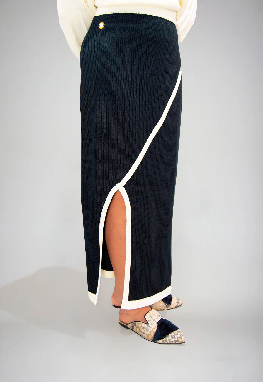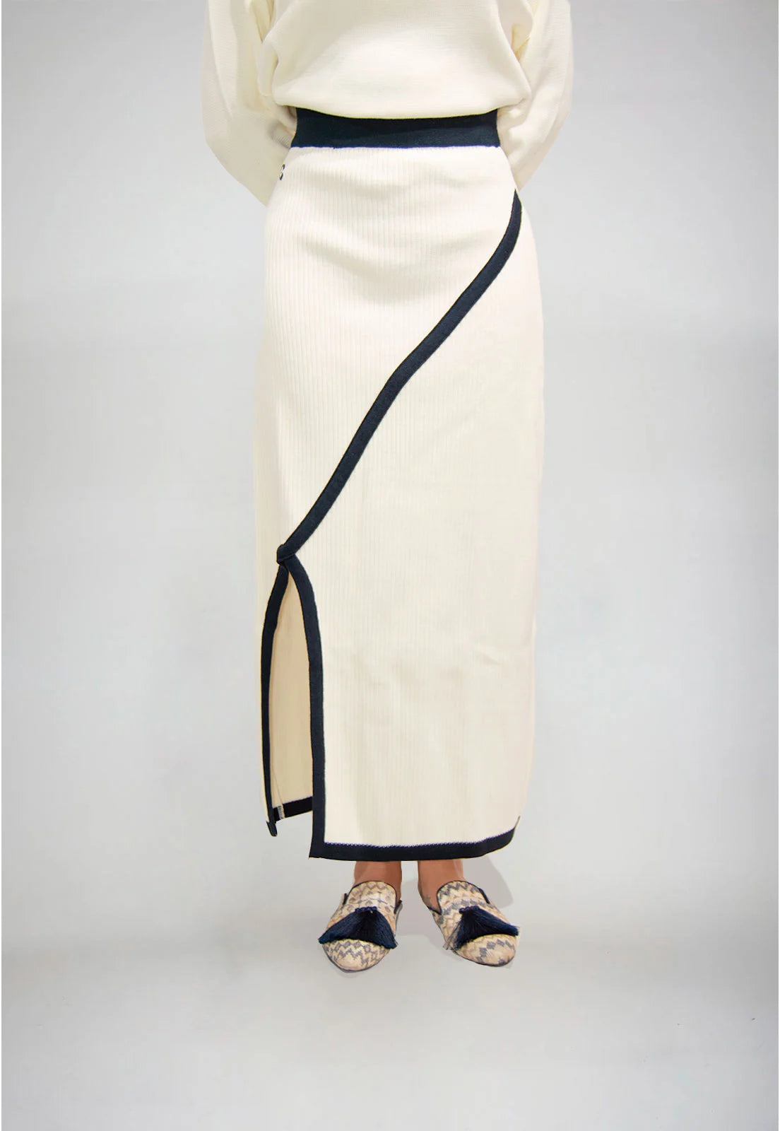 La Falda Vega, por su parte, está tejida en hilo acanalado, un detalle que estiliza la figura y da textura al look. Su largo midi y cintura alta con elástico oculto la hacen una prenda cómoda y favorecedora.