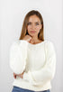 Cuello amplio y hombro caído para una caída suave; textura calada integral; ruedo y puños en rib para mayor durabilidad.