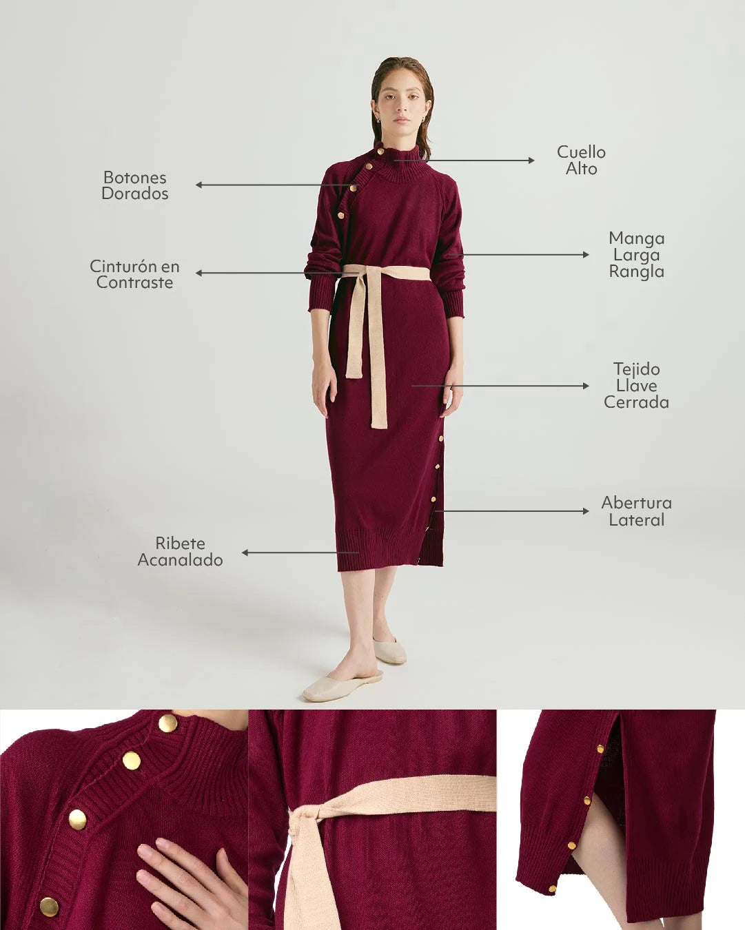 Este vestido incorpora un cuello alto con una abertura lateral adornada por cuatro botones dorados, un toque distintivo que añade refinamiento. Está confeccionado en hilo de alta calidad, garantizando durabilidad y comodidad a lo largo del tiempo.
