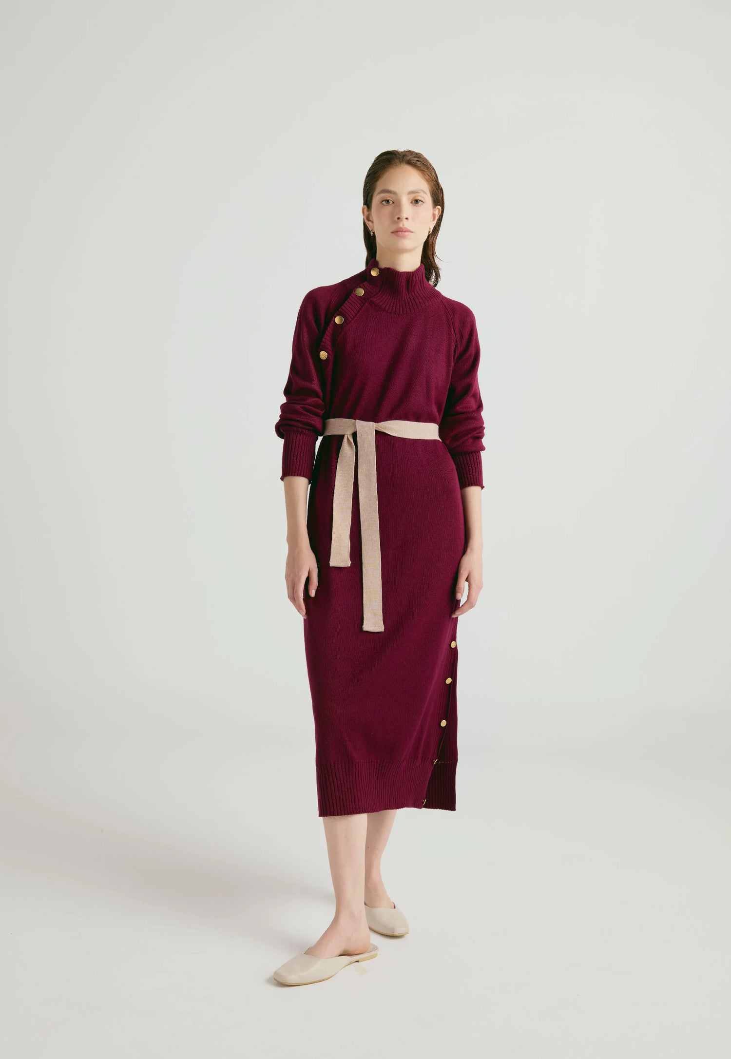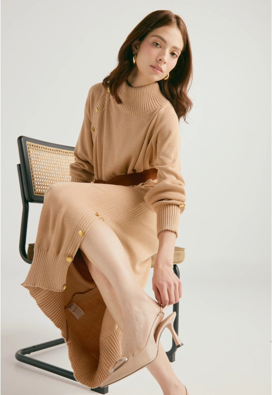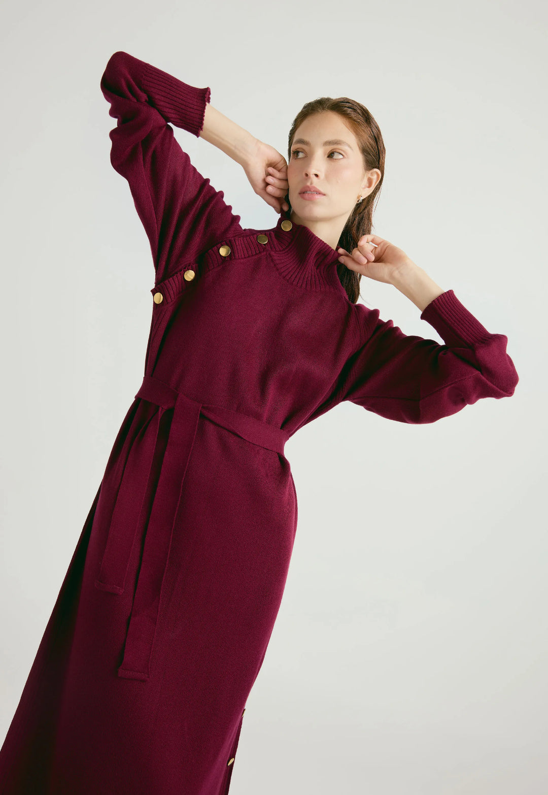 Vestido Danielle largo para mujer con cuello alto, botones dorados, cinturón ajustable y abertura en la falda, en tejido de punto cerrado.